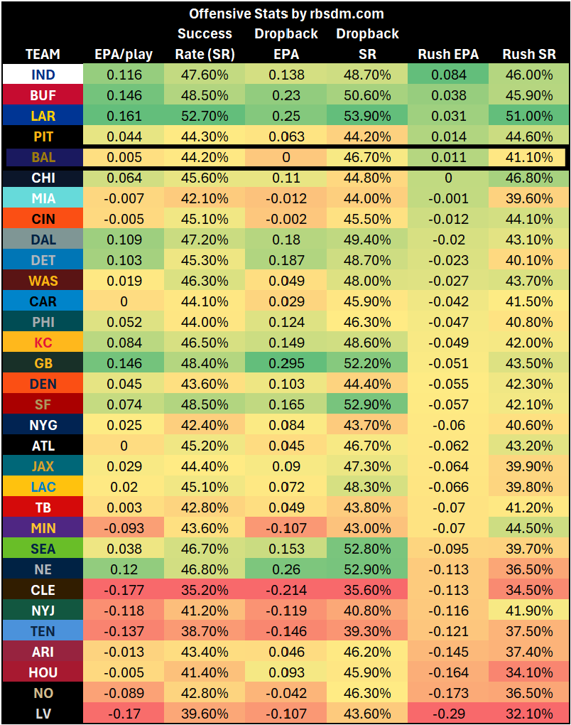 The Ravens rank 19th in offensive EPA per play and 18th in offensive success rate. They rank 24th in offensive EPA per dropback and 15th in offensive success rate on dropbacks.