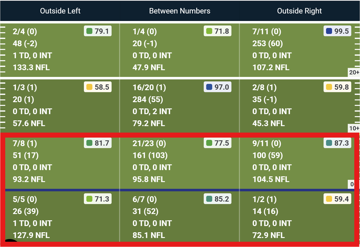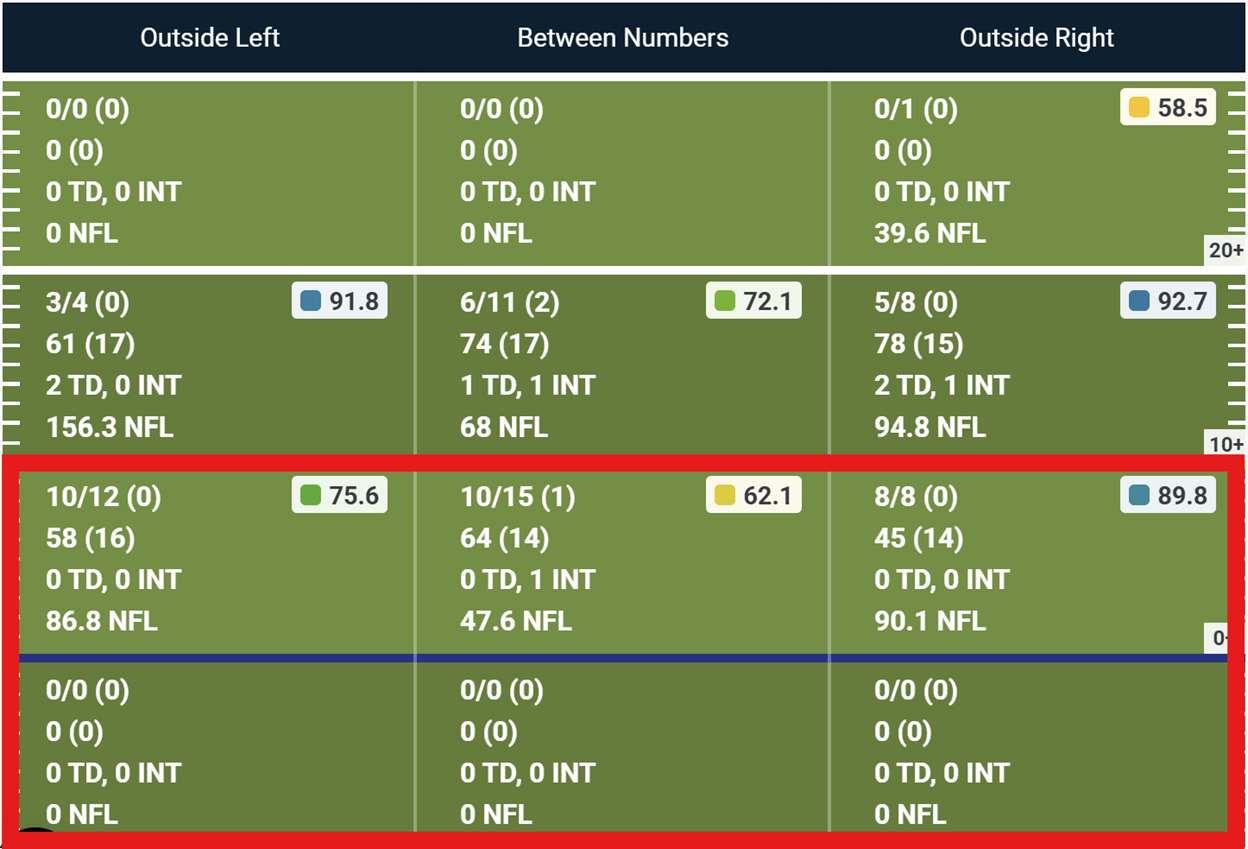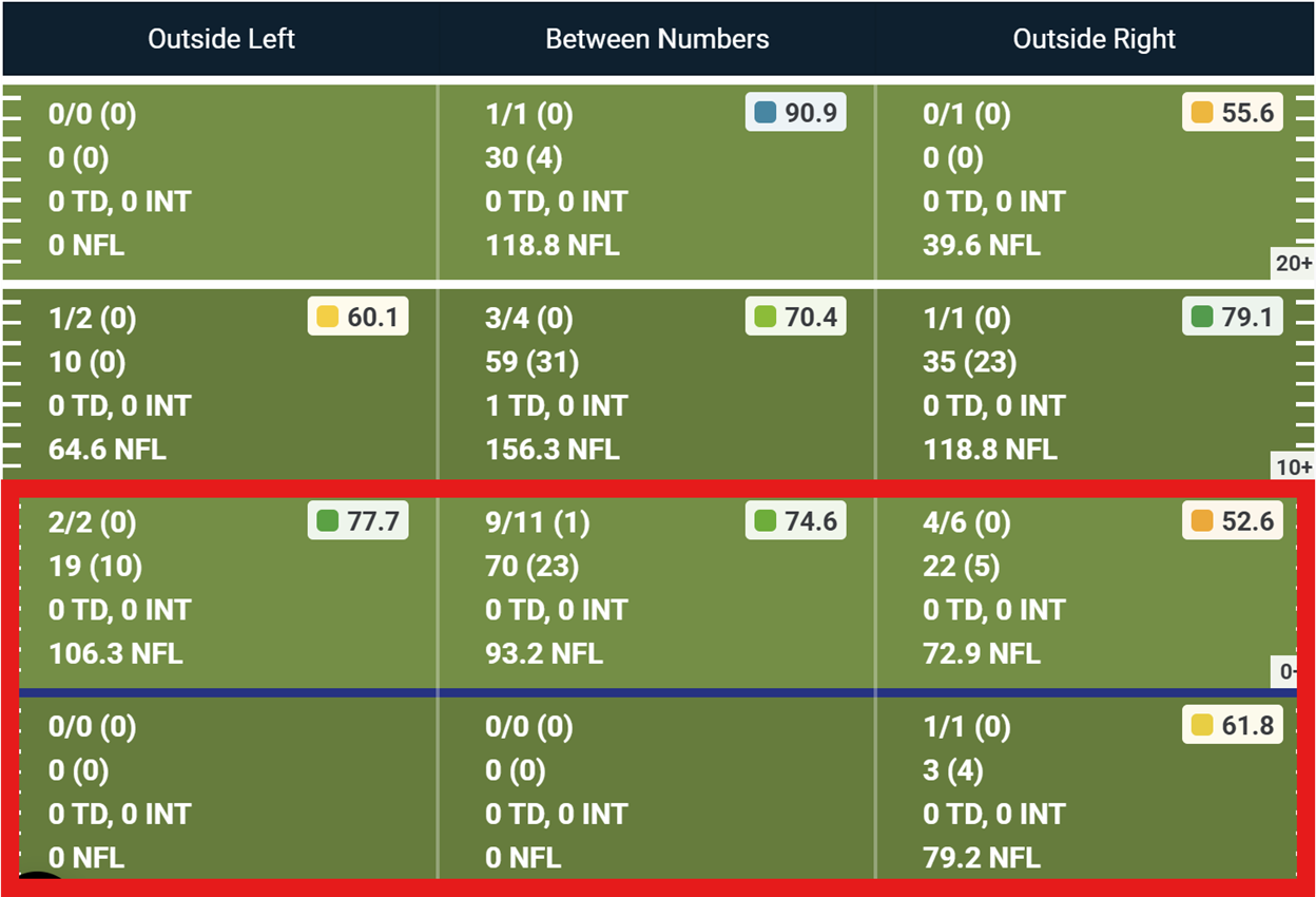 Based on this, Flowers has an unfavorable matchup (-6.0%), while Andrews has a very unfavorable one (-12.4%). Likely technically doesn’t have enough routes to qualify for the tool, but his coverage grade shows up as positive (+5.3%).