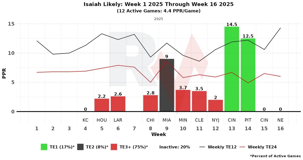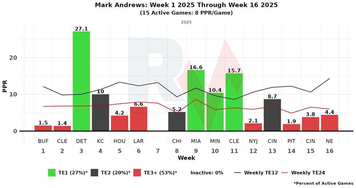 Likely has been enigmatic for most of his career; lately, he’s straight-up confounding. He had two TE1 games in a row in Weeks 13 and 14, and it felt like he was stabilizing after a slow start due to injury, and maybe even taking Andrews' job outright. Then, he up and goose-egged twice, including one game against abysmal Cincinnati, the best matchup for TEs this season.
