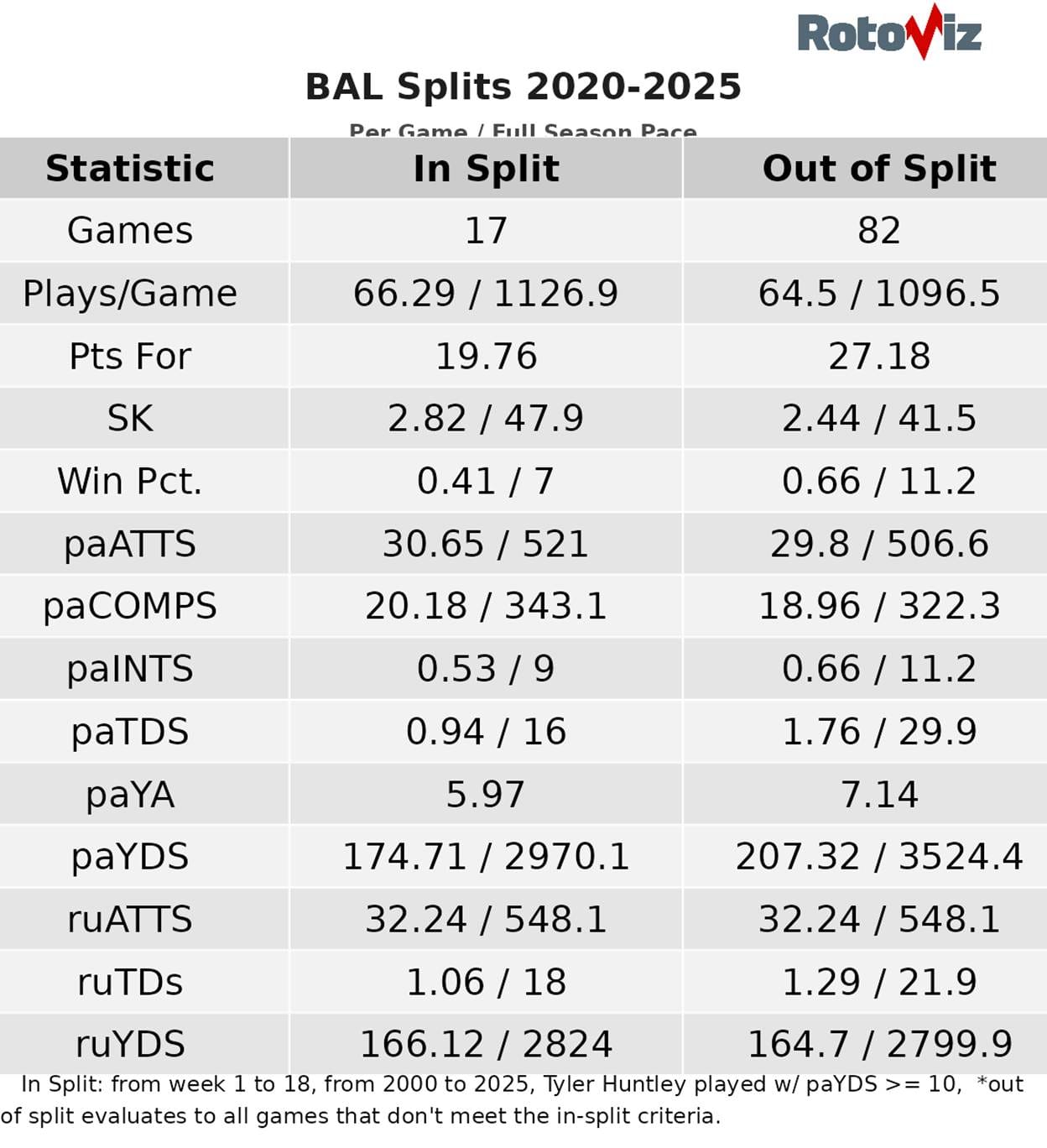 In games when Huntley has thrown for 10 or more passing attempts for Baltimore, they have really shortened up the passing scheme, which has led to a higher completion rate and fewer interceptions than we see with Jackson, but inversely, a lower yards-per-attempt and far fewer passing TDs. Essentially, they are less aggressive, so there are fewer negative plays, but at the expense of far fewer explosive plays.