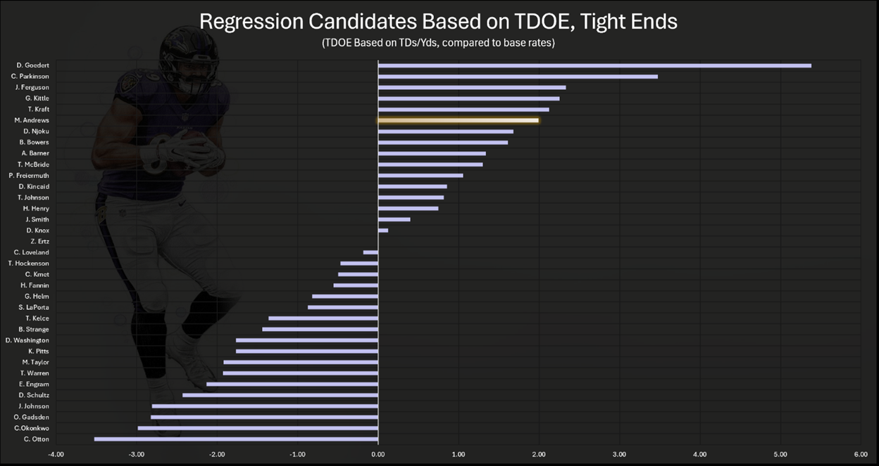 Contrary to Flowers, who scores meaningful fantasy points despite not scoring an adequate amount of TDs, Andrews fails to score meaningful points most weeks and is still a negative TD regression candidate based on TDs/Yds.