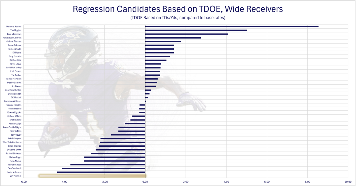 I called this out this past week, and Flowers scored a TD. Based on TDs/Yds touchdowns-over-expected (TDOE), Flowers pops as the most significant positive TD regression candidate among WRs.