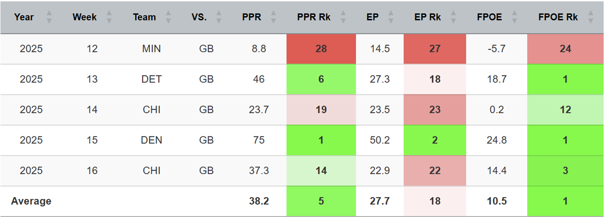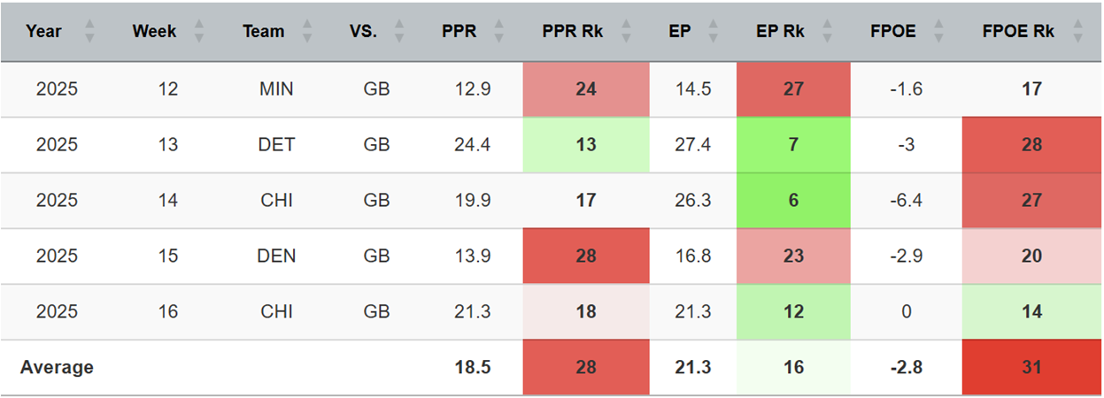 The Packers’ opposing RBs have only ranked 28th in their last five games against Green Bay. Teams rank 31st in fantasy points over expected (FPOE) against them during that span, demonstrating a lack of efficiency, even when their opponents try to run on them.