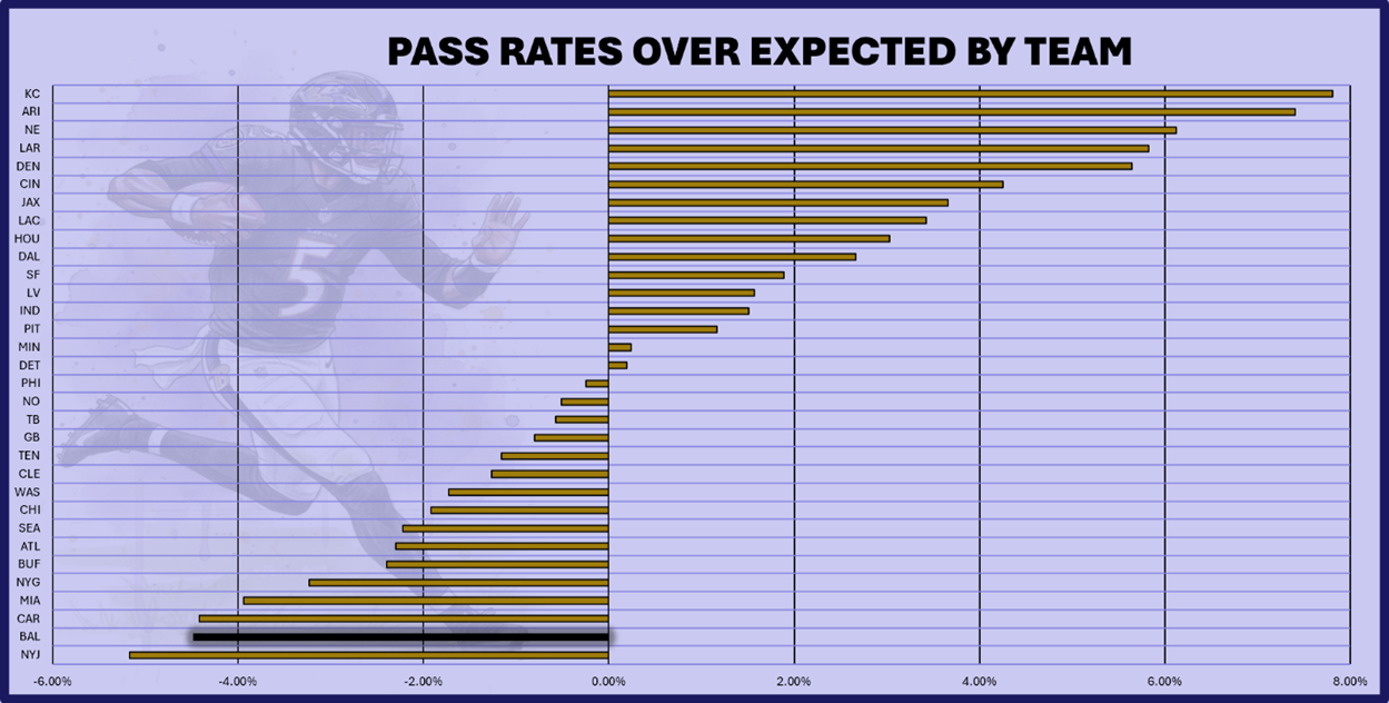 The Ravens average 27.8 seconds per snap (26th). Their pass rate is 51% (31st). Their pass rate over expected (PROE) is -4.48% (31st). Their default setting is to run, which has been the case most years in recent memory. The Ravens average 59 offensive plays per 60 minutes (T-28th). They average 30 pass plays per 60 minutes, the lowest average in the league.