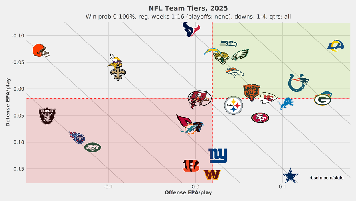 The Ravens are slightly below average in offensive EPA, and about average in defensive EPA allowed.