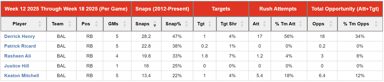 Obviously, RB Derrick Henry is the Ravens' primary back. In the last five games, he’s had 56% of the team’s rush attempts. This is not elite, but again, Baltimore has pretty high rush volume.