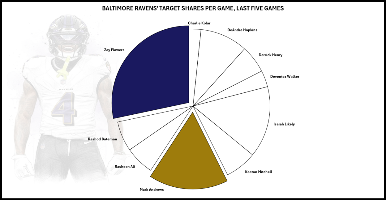 The Ravens have two players with a target share per game rate of at least 15% in their last five games: WR Zay Flowers (26.8%) and TE Mark Andrews (15.7%). TE Isaiah Likely barely misses the cut with a target share per game rate of 14.2% during that time.