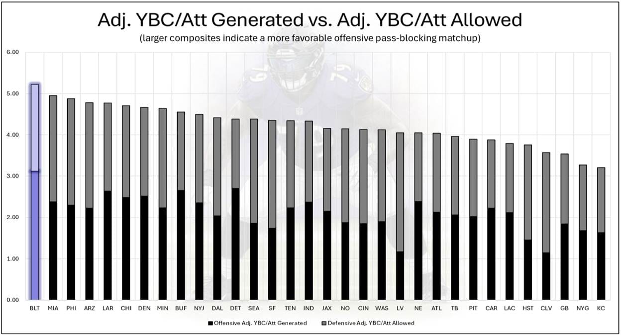 On the other hand, the Ravens’ offense has generated 3.12 adjusted yards before contact (adj. YBC/Att, 1st), and Green Bay’s defense has allowed 2.10 adj. YBC/Att (14th). The composite is even more favorable to the Ravens in run blocking as it is unfavorable to them in pass blocking—the most significant advantage of the week.