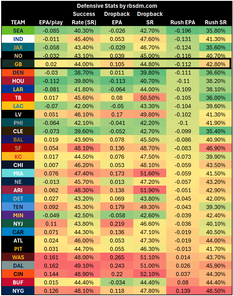 Green Bay’s defense is below average in EPA per dropback allowed and above average in rush EPA per game allowed.