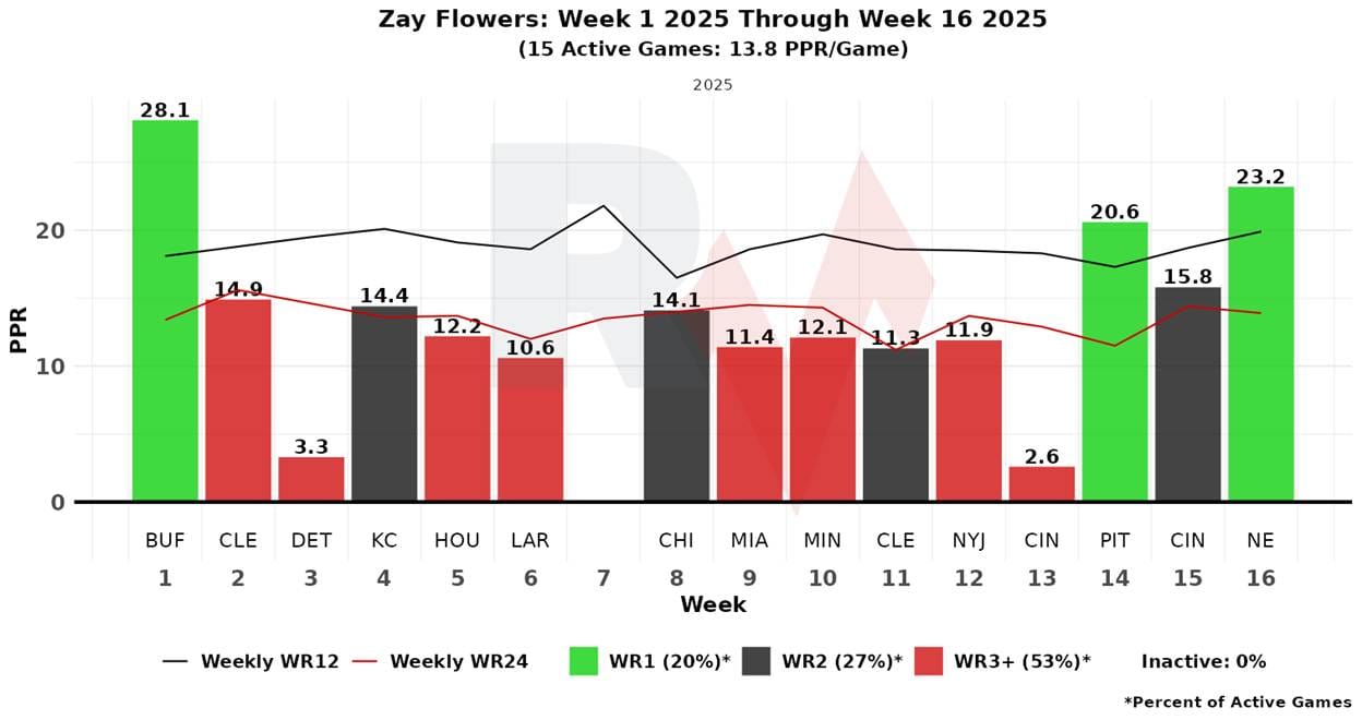 Flowers has a near-elite share, but of what? The Ravens are a low-volume passing attack, mitigating much of Flowers’ rate of opportunity. Flowers has only three WR1 games, although he’s done it twice in his last three games. He’s also had two single-digit PPR outputs. The pass volume isn't likely to increase on Saturday with Huntley under center.