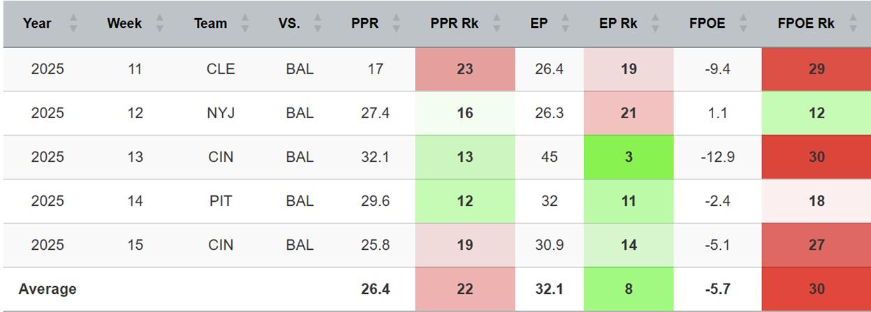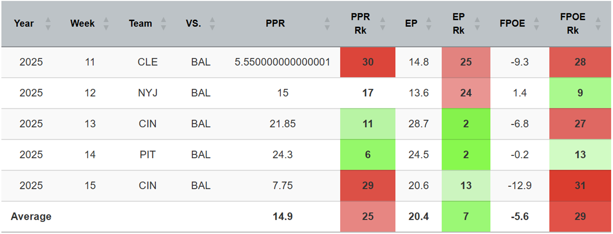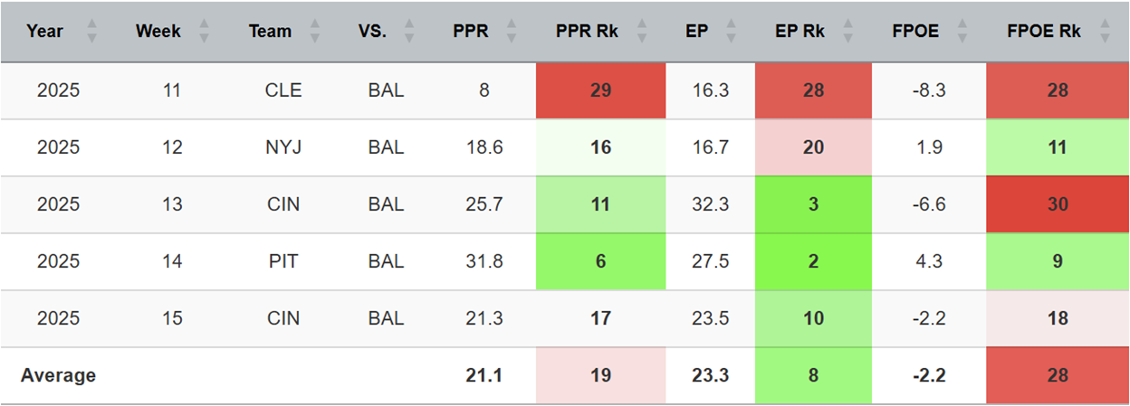 The Ravens have surrendered the 22nd-most fantasy points to WRs in their last five games. The disparity between their expected points (EP) and fantasy points over expected (FPOE) ranks indicates that teams are trying to pass on them, but they are not overly effective at it.