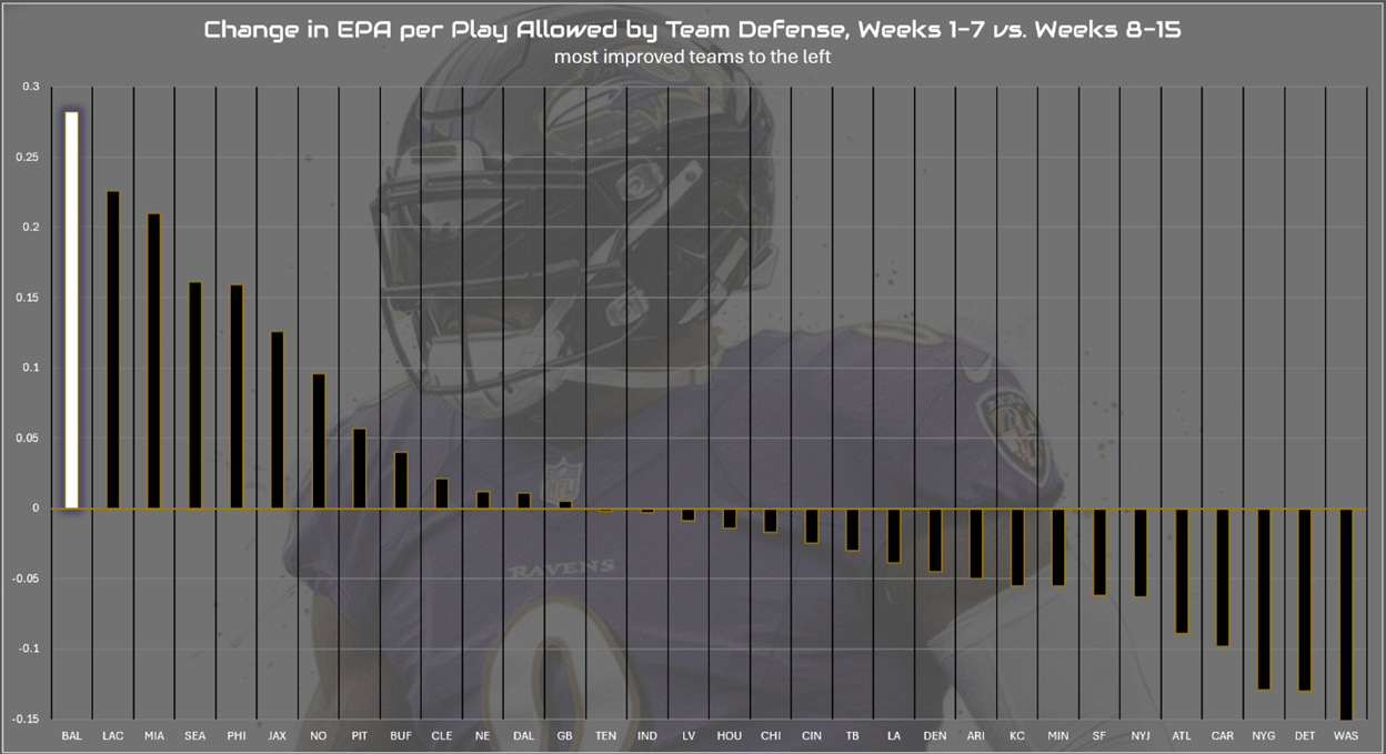 The Ravens’ defense started the season slowly, but they’ve righted the ship. After the first seven games, the Ravens’ defense was dead last in EPA per play allowed; since Week 8, they’ve been fifth. The swing in EPA per play allowed during that time is the most significant in the league.