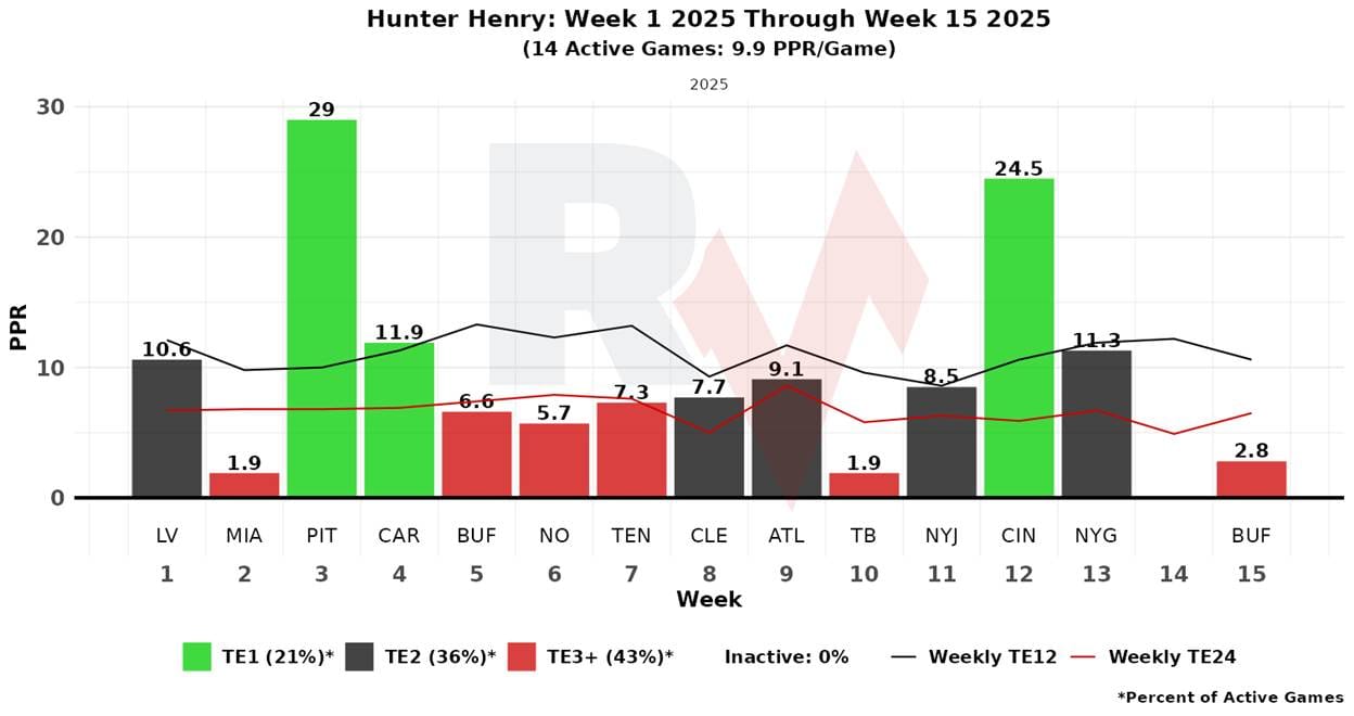 Henry has had his moments with two spike weeks, but he generally lives in the TE2/TE3 fringe, which is not a great place to be in any format. His upside is entirely dependent on TDs; hitting on that type of player in a fantasy matchup requires more luck than skill.