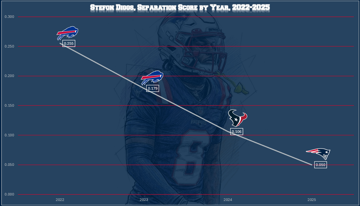 This is where Diggs’ effectiveness as a WR comes in. Diggs, 32, was an elite separator in his prime, but he has declined sharply in the past four years, seeing his separation score dip from an elite 0.255 in 2022 to 0.050 in 2025 (for context, among WRs with at least 150 routes this year, Davante Adams leads the NFL with a separation score of 0.187).