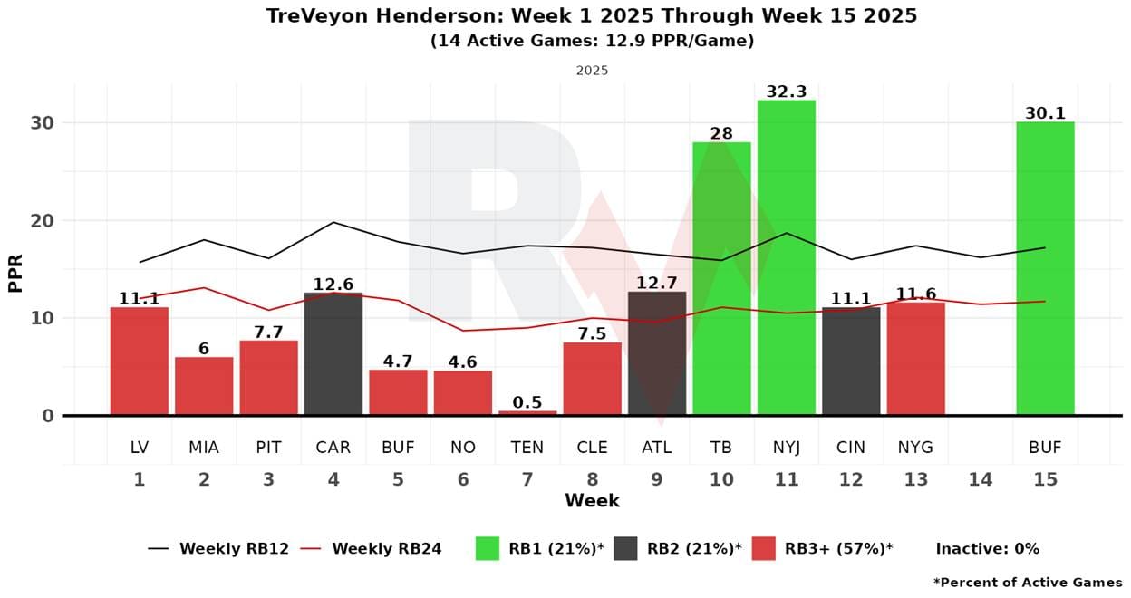 It took a while to get here, but RB TreVeyon Henderson has become the RB to own in New England. He has had spikes in Weeks 10 and 11, each of which fellow RB Rhamondre Stevenson missed, and again last week.