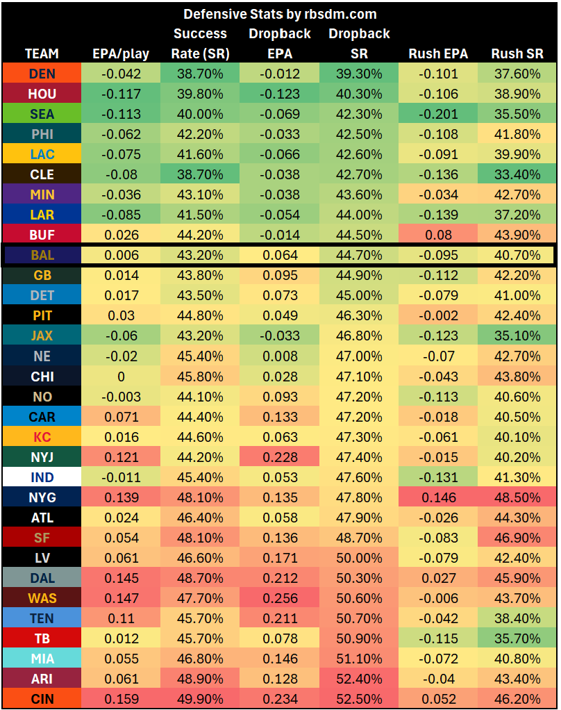 The Ravens rank 14th in EPA per play allowed and 10th in defensive success rate. They rank 17th in EPA per dropback allowed and 10th in defensive success rate on dropbacks.