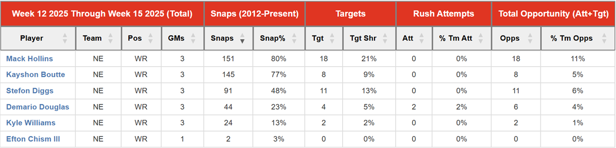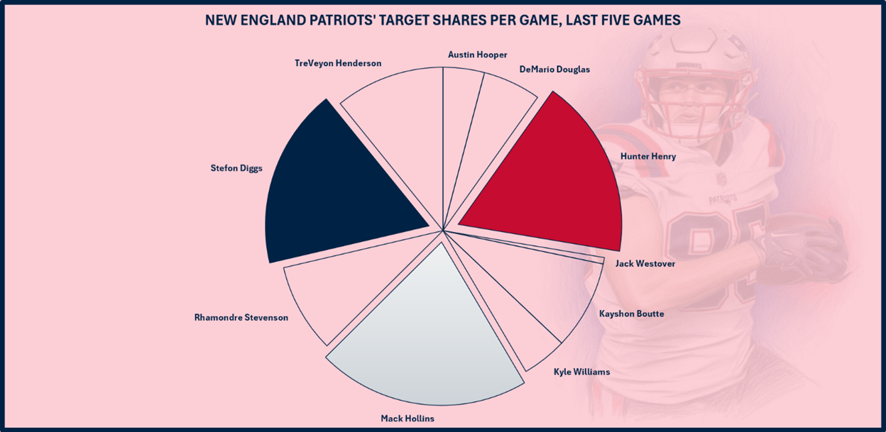 The Patriots have three pass-catchers with target-share per-game rates of at least 15% in their last five games: WRs Mack Hollins (21.4%) and Stefon Diggs (18.2%), and TE Hunter Henry (18.2%).