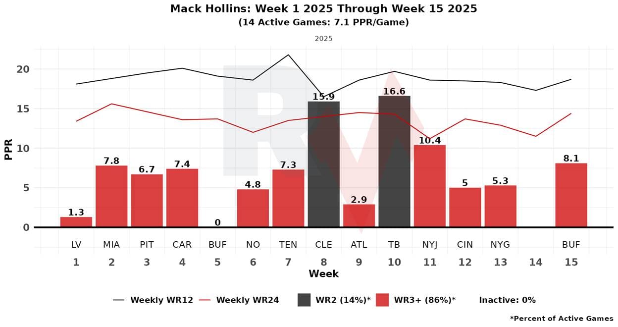 The natural reaction is to assume that Hollins, as the recent target share leader, would be playable. Hollins is the type of player who does things coaches like; he is not an overly dynamic receiver. By volume alone, he carries a bit of a floor that may be usable in deep PPR leagues where up to 4-5 WRs can be played, but expect no upside at all. This is not my preferred type of flex, of course, but there can be an application.