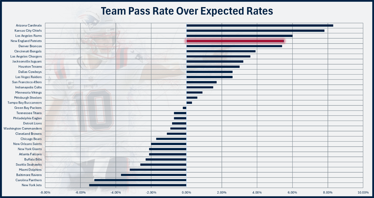 The Patriots average 28.4 seconds to snap (T-29th) and maintain a pass rate of 54% (T-24th). They spend a bulk of their plays in a neutral script but spend almost the rest of their time at a lead of seven or more points. They have rarely trailed by seven or more points. When leading by as much, their pass rate falls to 47%, which helps explain why their pass rate over expected (PROE) can still be +5.50% (4th) despite a lower overall pass rate.