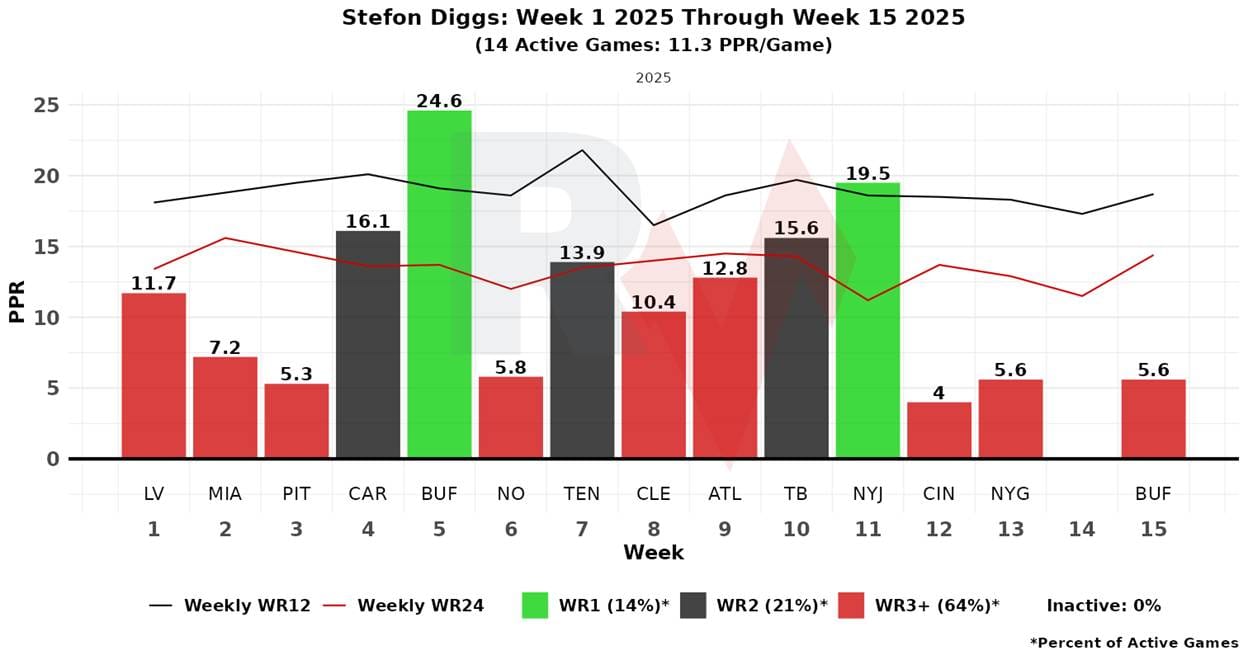 This is tied to a steep reduction in opportunity; Diggs has only had a 48% snap share in his last three games, trailing Hollins and WR Kayshon Boutte for the team WR lead. Diggs’ route rate is down to 54.8% during that time, down from 64.1% in the first ten weeks of the season.