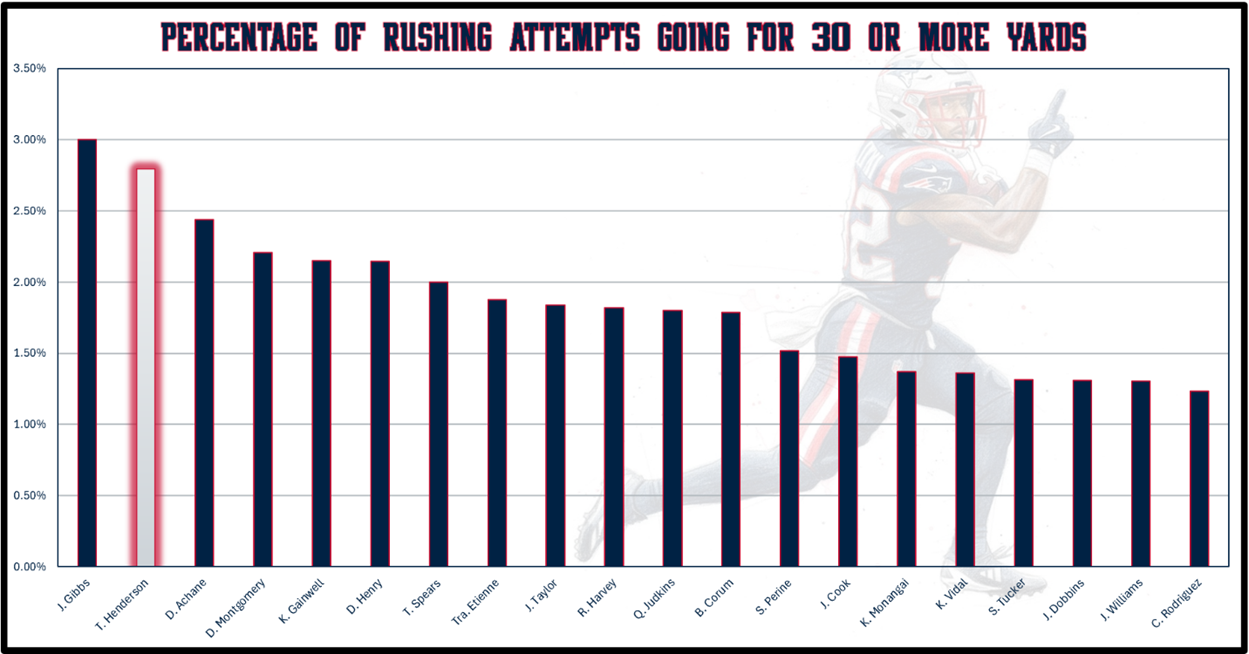 Henderson can score from anywhere on the field. He has the second-highest percentage of rushing attempts going for 30 or more yards, behind only Jahmyr Gibbs, who was one of his most common comps heading into the NFL draft. When Stevenson was injured, and Vrabel was forced to give Henderson an extended look, he demonstrated valuable explosiveness that couldn’t be justifiably left off the field.