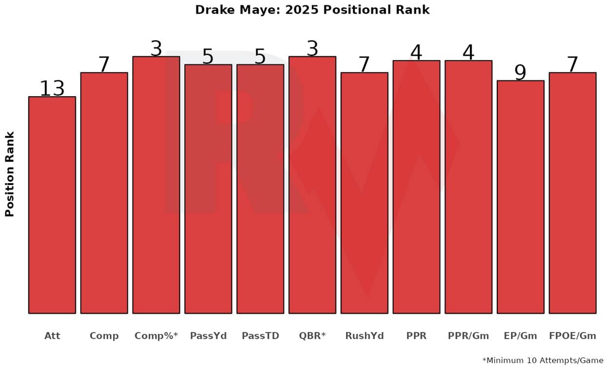 The good news is that, in fantasy football, sacks are less harmful than positive rushing gains are helpful. Maye’s scrambles have produced 349 of his 362 rushing yards (7th), adding yardage that gives him a heightened floor and ceiling.