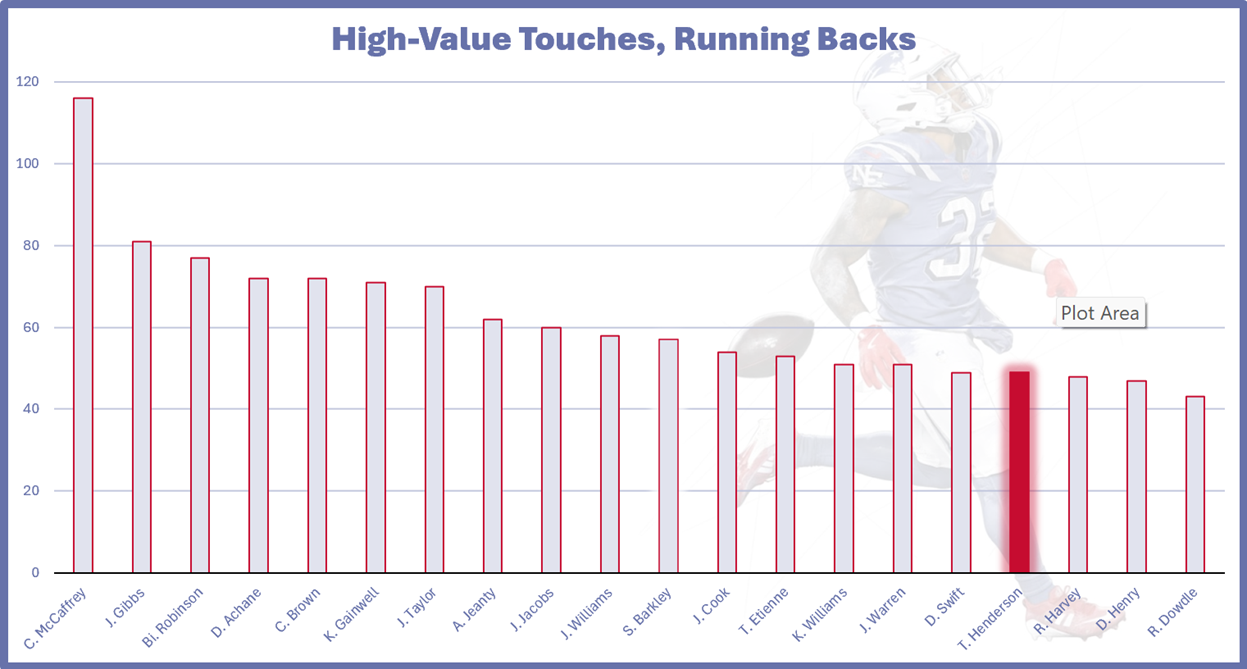 Henderson is given more high-value touches (HVTs) than Stevenson as well. Despite a minority share in a committee for much of the season, Henderson ranks 17th in HVTs.