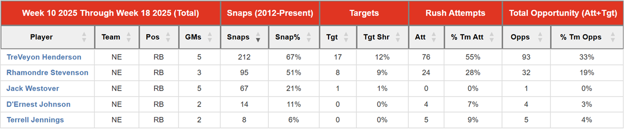 In the last five games, Henderson has jumped up to a 67% snap share, a 12% target share, and 55% of the team’s rush attempts. Notably, however, his snap share was 84% and 88% in Weeks 10 and 11 while Stevenson was out. In Week 12, the first week Stevenson returned, Henderson earned only a 63% snap share, and he has been under 50% in each of his last two games, less than Stevenson.