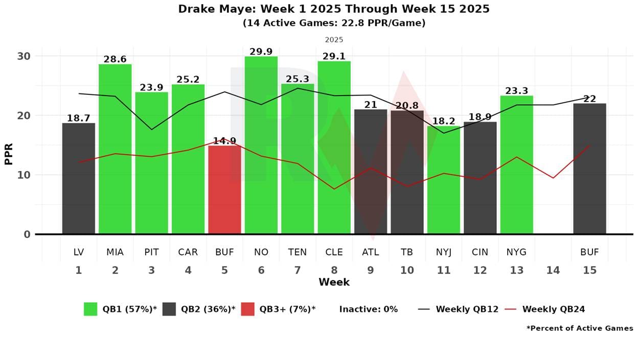 Maye has returned eight QB1 weeks in 14 games. He has never scored fewer than 14.9 points, an incredibly stable floor. Maye has had three occasions when he has scored near 30 fantasy points, indicating he is capable of a ceiling as well.