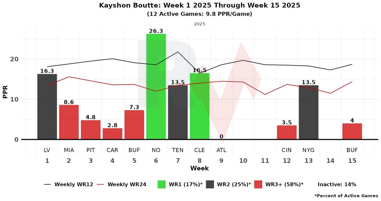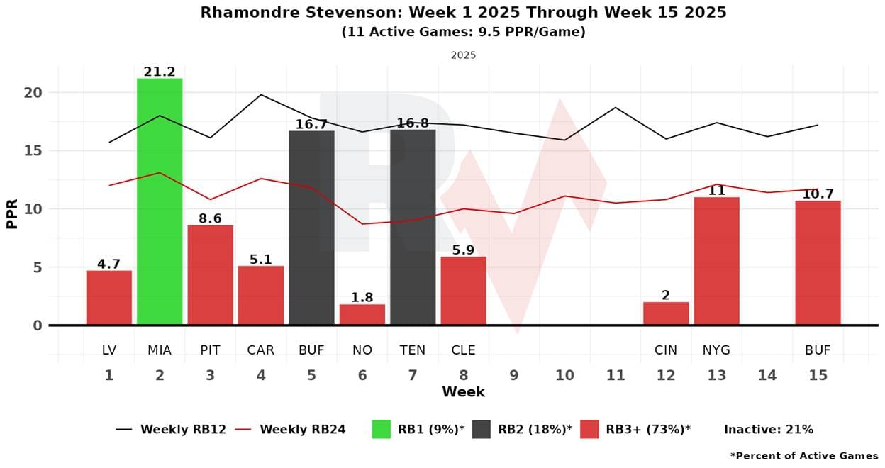 Stevenson seems like a pretty underwhelming play right now because it has been a while since he’s made an impact. Admittedly, if we accept Week 12 as a ramp up from injury and Weeks 13 and 15 as the first two games fully back from injury, it doesn’t seem quite so bad; he was right on the RB2/RB3 edge in each game—flex territory—and the only real reason he has been out of that range since Week 7 is related to his injury and absence, as well as the Patriots’ bye.