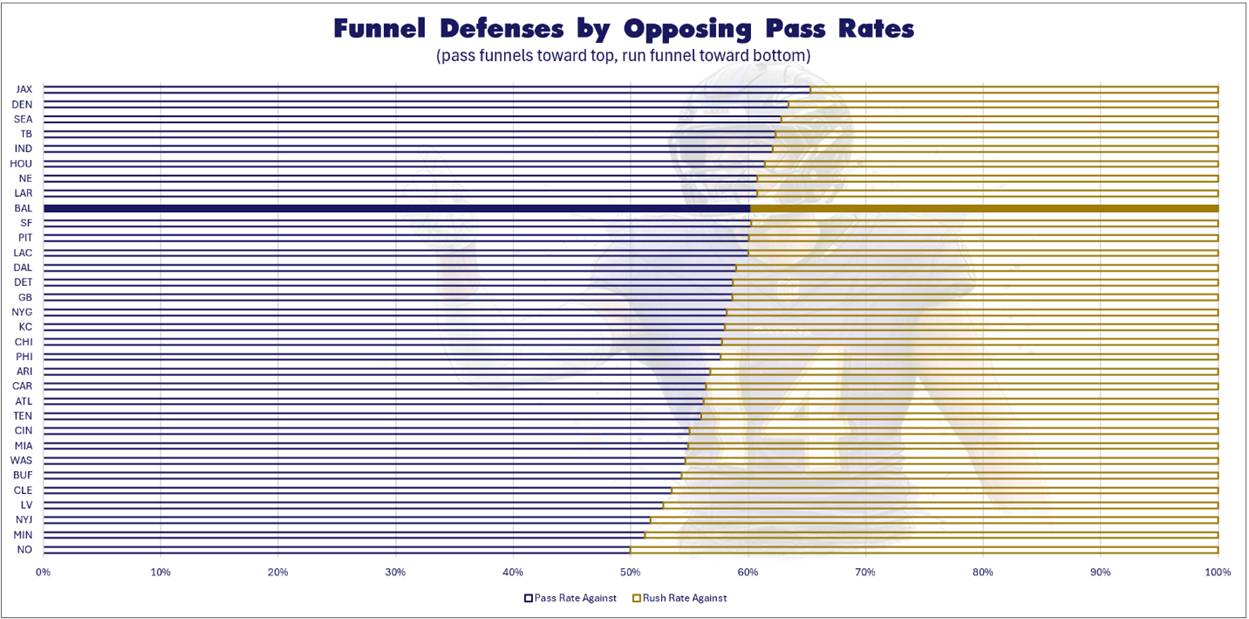 Based on their season-long opposing pass rates, the Ravens come off as a slight pass funnel; this should not be overstated, as this tends to matter more at the extremes, but it’s at least interesting, especially when paired with New England’s offensive dropback EPA and rush EPA disproportion.