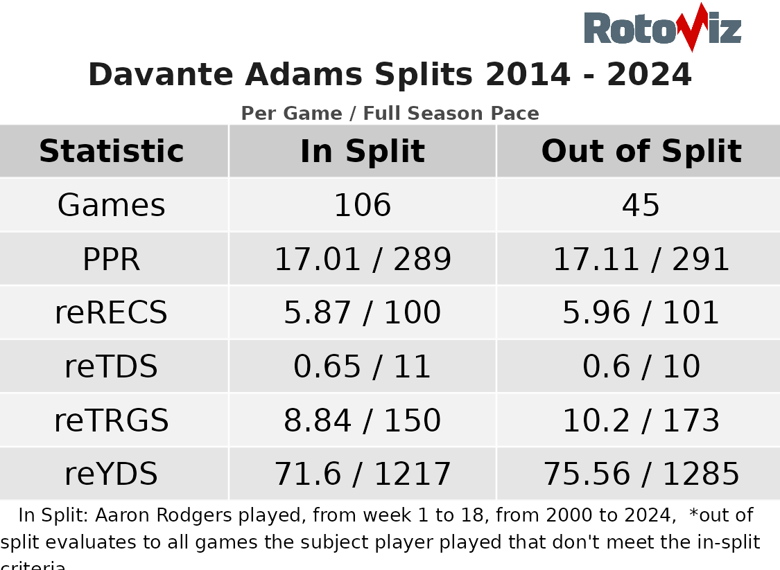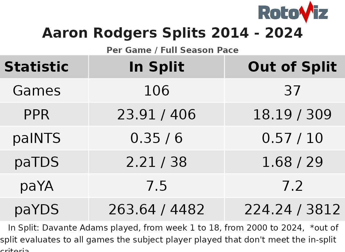 Trusting Adams will suddenly cure all of Rodgers’s woes is complicated. He and Rodgers are getting old, with Rodgers now 40 and Adams 31. Also, there is little hope in general that Rodgers will fix Adams (other than the fact that Adams has been driven not to play due to his dissatisfaction with the Raiders and thus has been scoring zeroes). Adams’s performance is not as starkly different when he played without Rodgers.