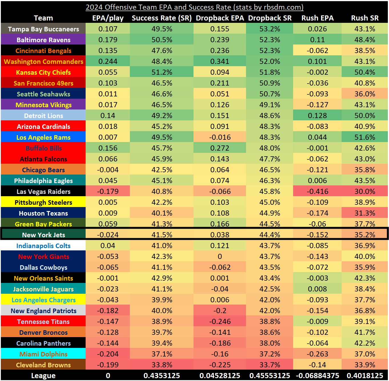 The Jets are renowned for their defensive prowess, but offensively, it’s been tough sledding thus far. New York ranks 22nd in team EPA per play and 19th in offensive success rate. They are also 19th in EPA per dropback and 20th in offensive success rate on dropbacks.