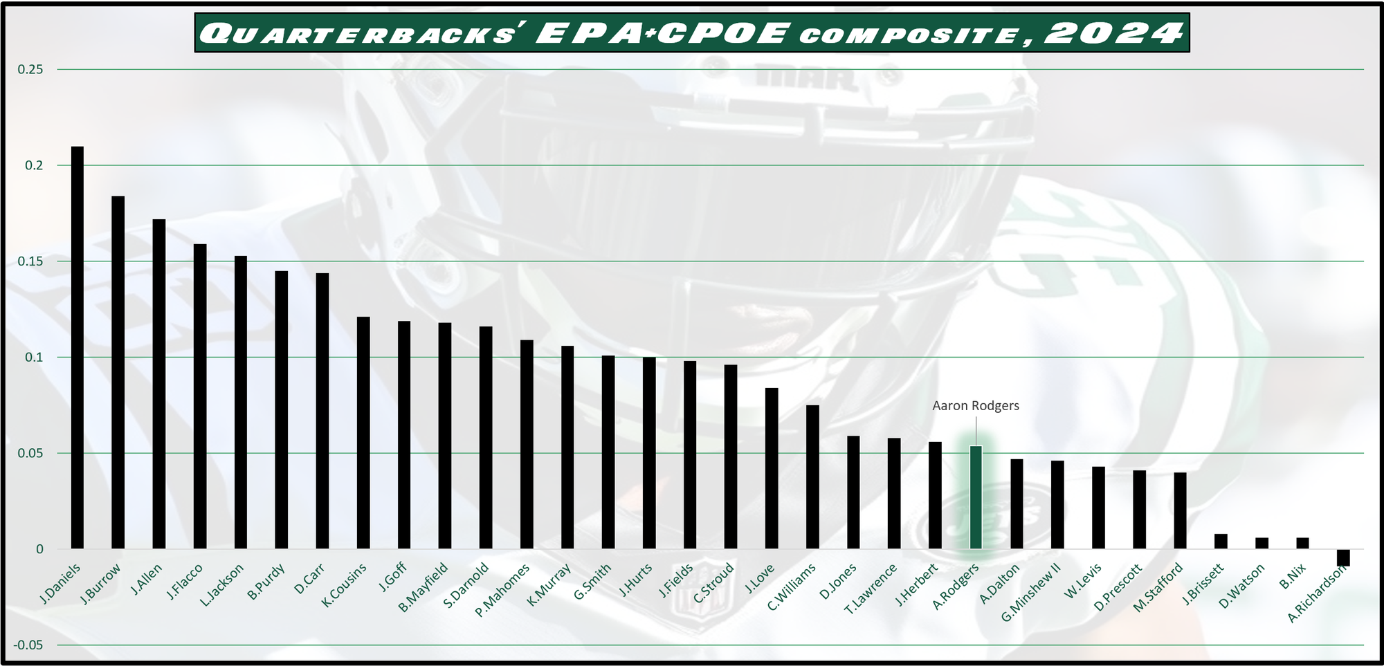The Jets have thrown a lot so far in 2024. They are fifth in pass rate over expected, and as a consequence, Aaron Rodgers has the fourth-most attempts in the league. Tied mainly to that volume, he also has the 10th-most passing yards and the eighth-most passing TDs. However, Rodgers has not been as efficient as he used to be, posting -17.9 FPOE, 54th among all QBs. His -3 FPOE per game ranks 47th and is the worst rate of his career since his rookie season in 2005. He ranks 23rd in EPA + CPOE composite, just before Will Levis, Gardner Minshew, and Andy Dalton and slightly behind Trevor Lawrence.