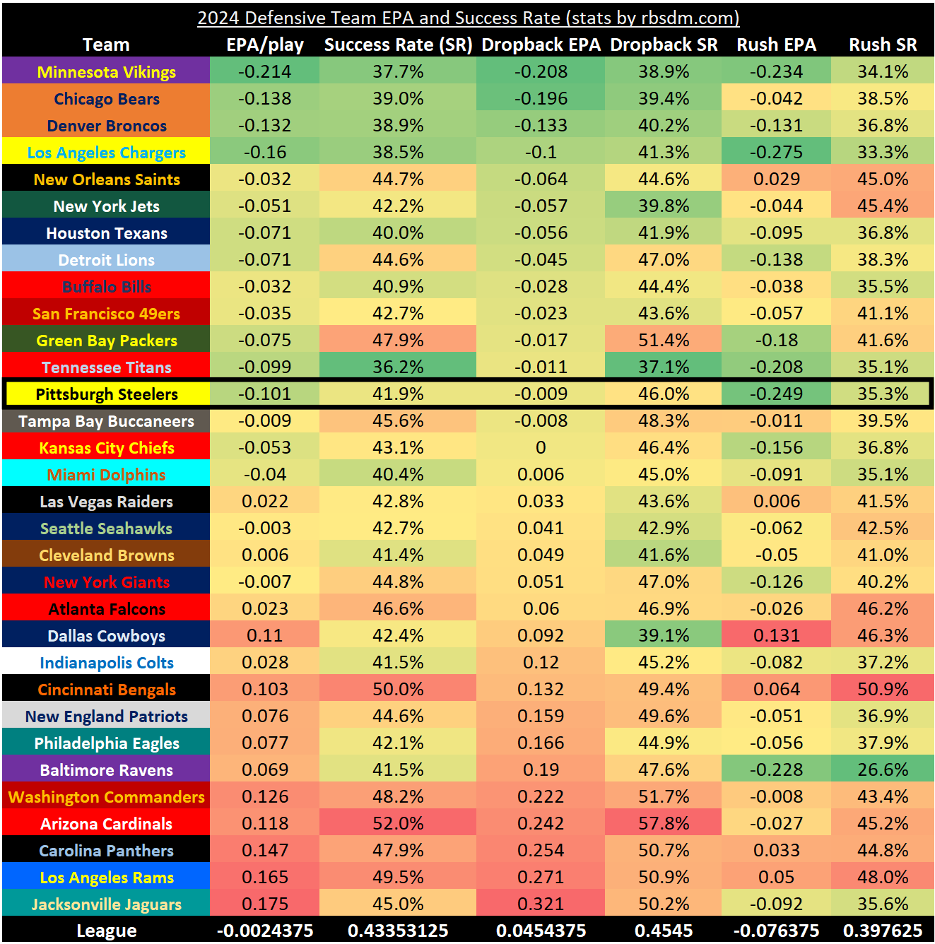 The Steelers’ pass defense ranks 11th in fantasy points allowed to QBs. It also ranks 13th in EPA per dropback allowed and 18th in defensive success rate on dropbacks. This indicates that Pittsburgh is slightly better at controlling big plays than stopping long, sustained drives through the air.