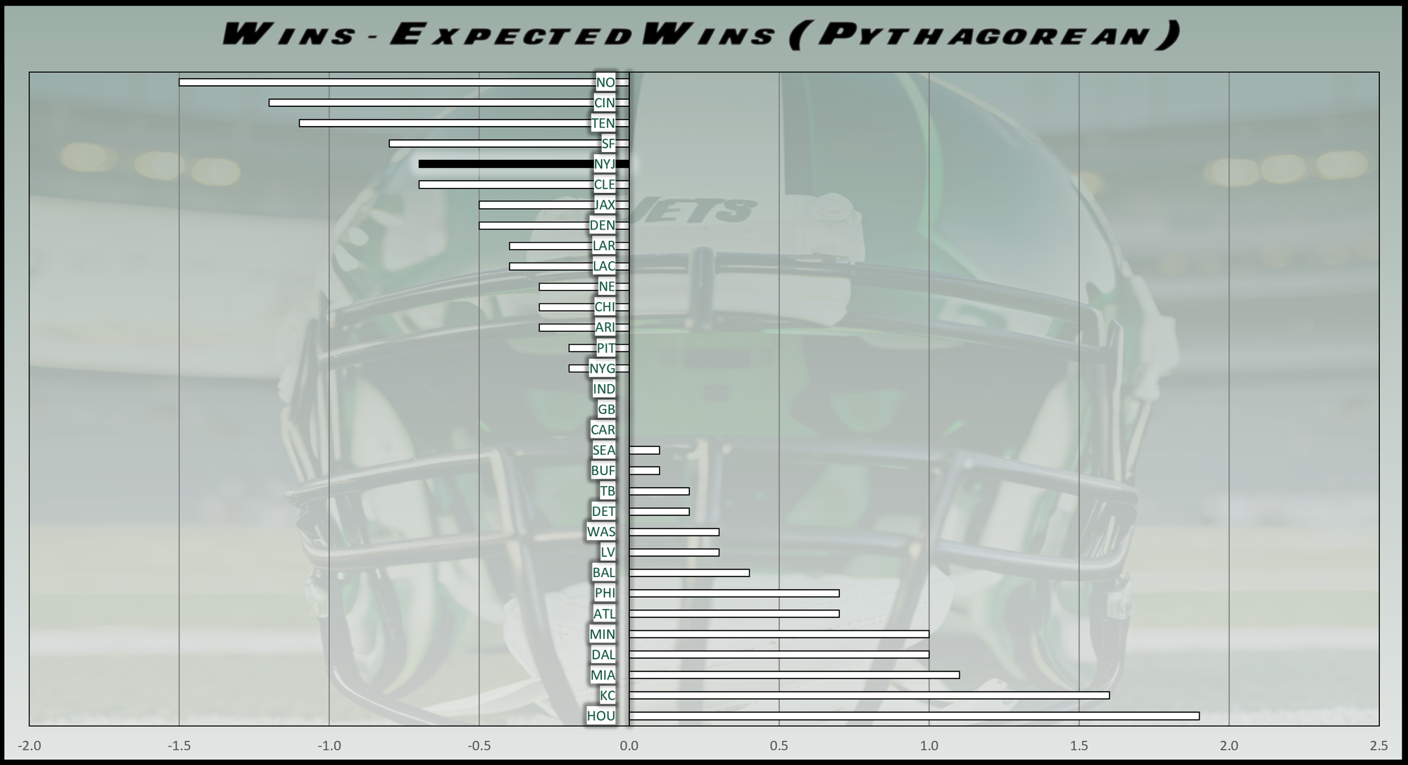 One basic but somewhat reliable way to assess team-level regression is to consider which teams have the best point differential per game and compare it to a win-loss record. Using point differential we can devise a Pythagorean expected wins model. If we subtract real wins from expected wins, we can understand which teams have been luckiest or unluckiest in the win column. In 2024, the New York Jets have been the fifth-unluckiest team based on this formula.