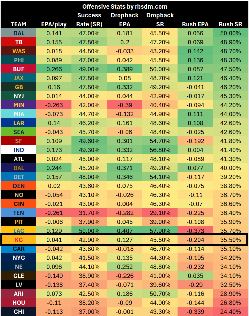 The Kansas City offensive line is far more neutral in the passing game, but Kansas City is below average in both offensive EPA per rush and offensive rush success rate. Thus far, this has been the worst aspect of their offense.