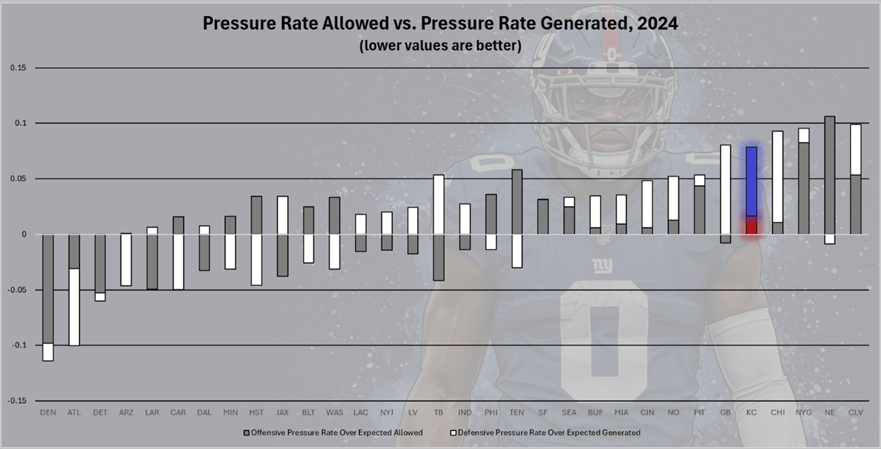 The Chiefs should struggle to protect Mahomes in this one, as the Giants have built an impressive stable of pass-rushers, especially when they can get edges Brian Burns, Kayvon Thibodeaux, and Abdul Carter on the field at the same time. Based on the 2024 pressure rate over expected stats (before Carter), the Giants have one of the most significant pass-rushing advantages of the week.