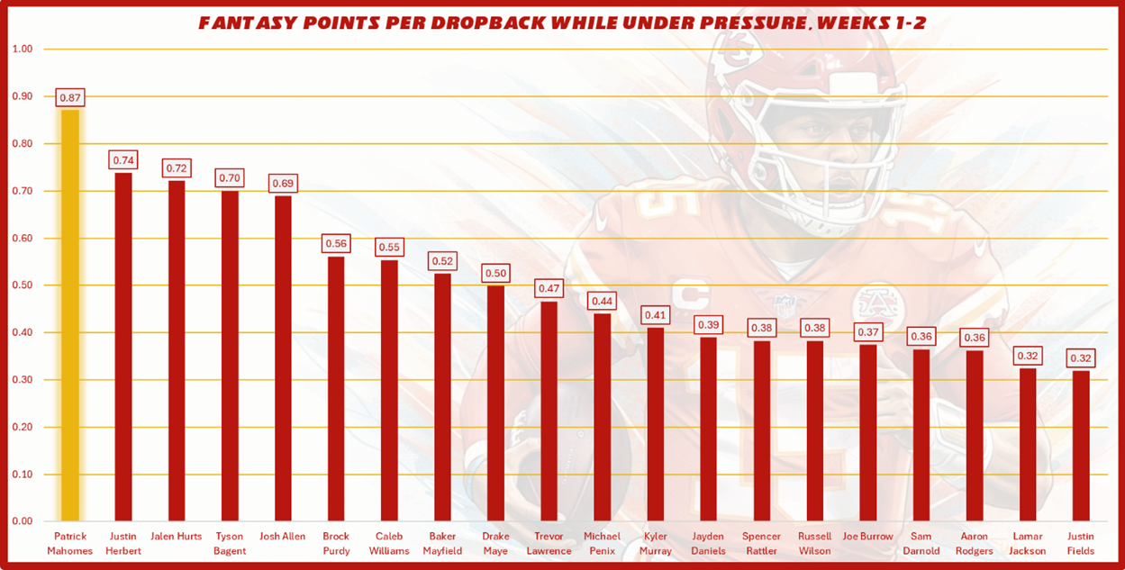 Mahomes handles pressure reasonably well, of course, and it may only prompt him to scramble even more if he is flushed out of the pocket. Mahomes has the most fantasy points per dropback through two games while under pressure. All in, Mahomes seems like a safe play this week, which would only be made better if Worthy can somehow go.