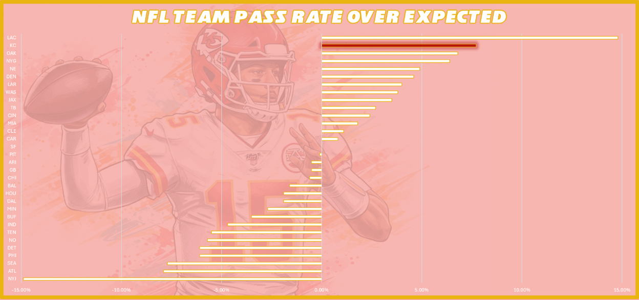 The Chiefs have passed 62% of the time, tied for the 10th-highest pass rate, but their +7.7% pass rate over expected (PROE) ranks second behind only the Chargers.