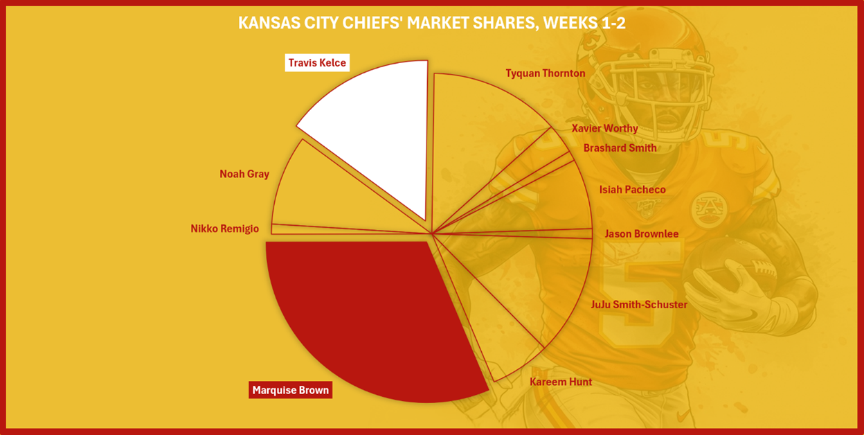 The last man standing has been Brown, who soaked up an unbelievable 42% market share in Week 1, the third-highest single-game market share of his career, behind only back-to-back efforts of 44% and 47% for Baltimore in 2020. Against Philadelphia last week, that tumbled to a modest 17%, more in line with Brown’s usual outputs.