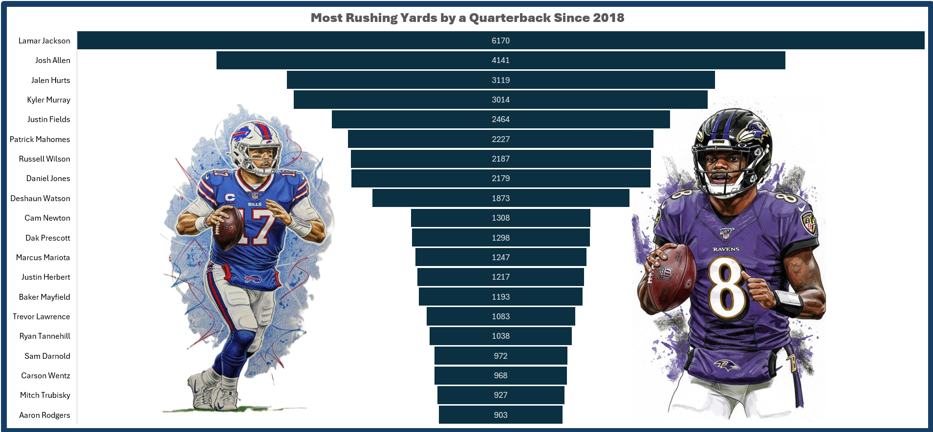 Jackson and Allen are the top two QB rushers since 2018, their mutual rookie season. This is part of what makes them special. The other part is their equal acumen as a passer.