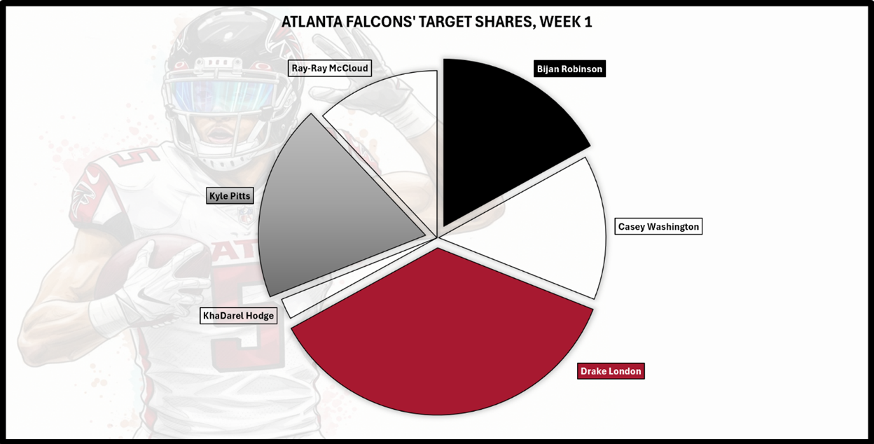 Last week, WR Drake London was targeted 15 times (1st), recording a 36% market share (8th). TE Kyle Pitts showed signs of life with a 19% share. WR Darnell Mooney didn’t play, but he has been cleared for Week 2. Expect him to siphon everything WR Casey Washington had last week and more; Washington had 44 routes and a 93.6% route participation, which led the team (he's out this week with a concussion, regardless). London also had a late shoulder injury in Week 1 and had limited practice this week, but he carries no injury designation into Sunday night’s game.