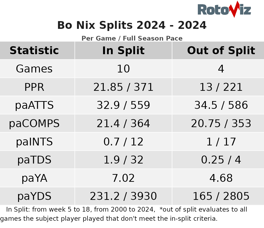 Since then, Nix has ranked seventh in fantasy points. Some of this is owed to his rushing ability; Nix ranks eighth in rushing yardage and is tied for seventh in rushing TDs since Week 5. Still, he can hold his own as a passer, ranking 13th in passing yardage and fifth in passing TDs during this same span. He ranks sixth in EP among QBs since Week 5 as well.