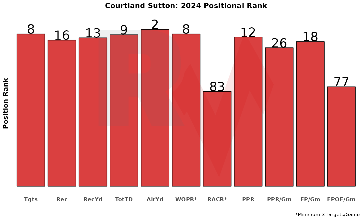Even with the Broncos’ high pass rate and effectiveness in the passing game, they cannot sustain players with sub-15 % shares for fantasy. During this period, Vele's 13% amounts to 26 total targets, which doesn’t even rank in the top 75 across positions. The only reliable option in the Broncos’ passing game is Sutton, who ranks as the WR12, owning the eighth-most targets, including the seventh-most first-read targets.