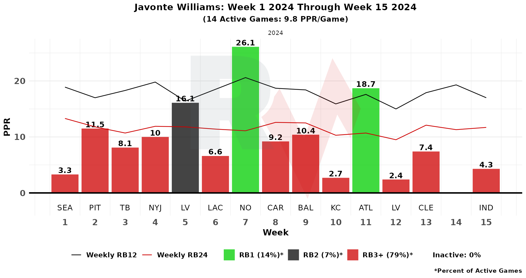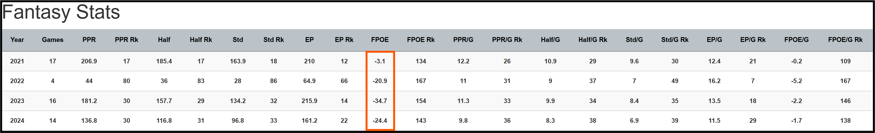 Many will attribute this to injuries, but Williams has always been an inefficient player. The strength of his reputation came on a wave of three-straight RB1 performances in Weeks 12-14 in his rookie year. In 47 career games, he has failed to be an RB1 or RB2 (in other words, he was an RB3 or worse) for 72.3% of his games; he has never had positive FPOE for a season and three times, has recorded an FPOE of -20 or less.