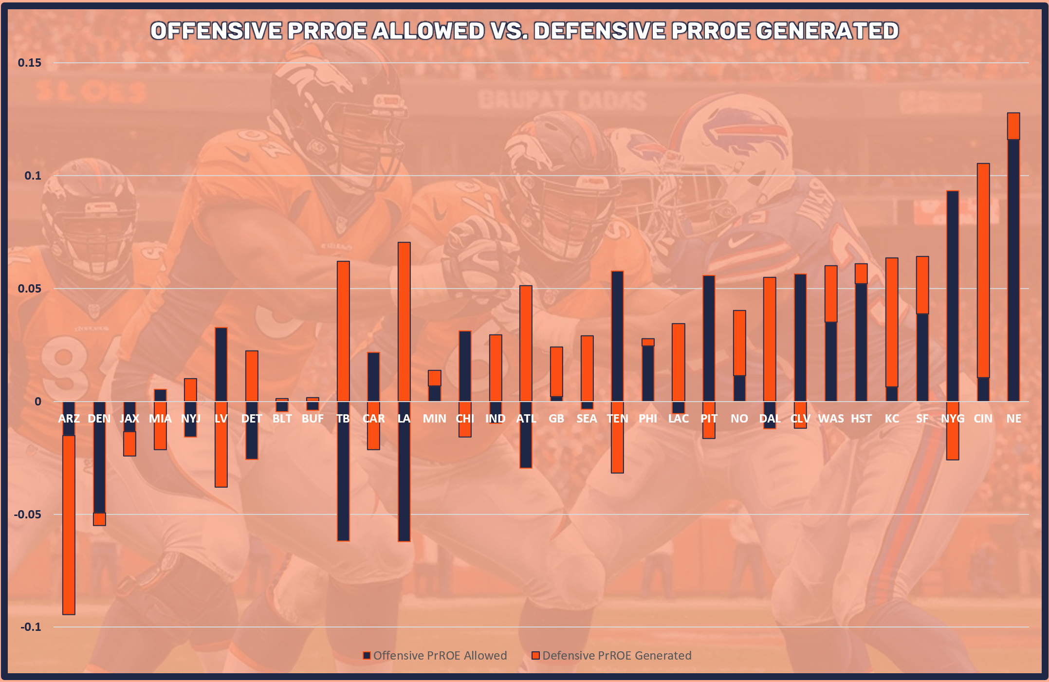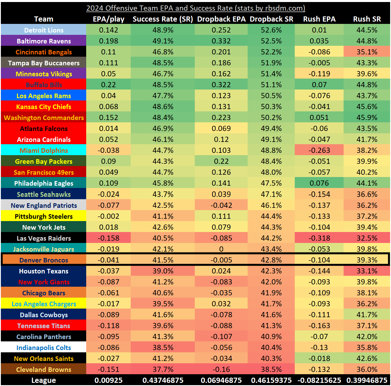 Payton-led teams have traditionally been among the better-rushing teams in the NFL, but the Broncos haven’t gotten strong footing in the running game this year. They are ranked 19th in EPA per rush and 20th in offensive success rate on rushes. Their run blocking has been very average, and their stable of RBs has been frequently underwhelming.