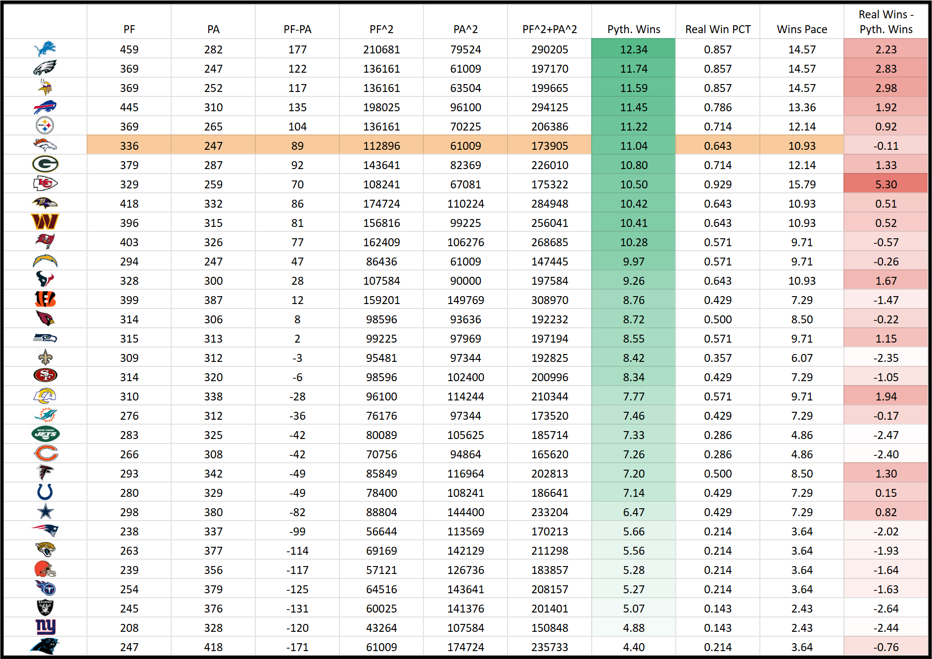 Pythagorean Wins is a formula that uses points for and points against to develop an expected wins model. According to the model, the Broncos rank as the sixth-best team in the NFL with just over 11 expected wins.