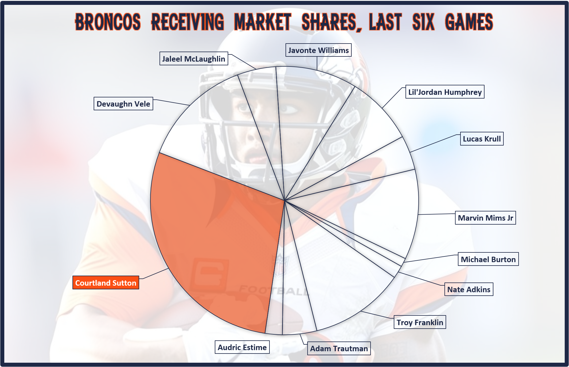 The Broncos only have one player with at least a 15% market share in the past six games: Courtland Sutton (28%). The next closest is Devaughn Vele at 13%.