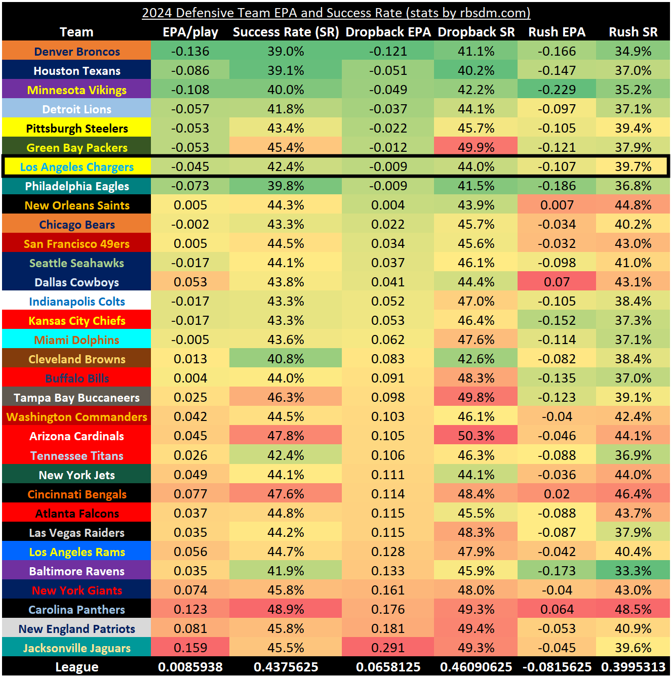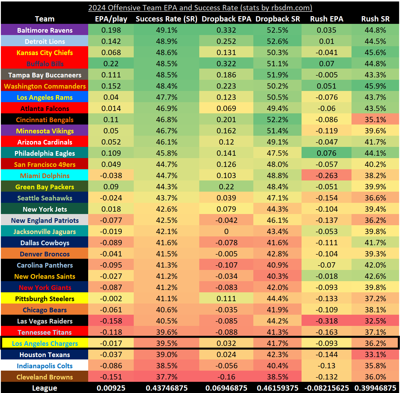 The Chargers rank 17th in EPA per play and just 29th in offensive success rate.